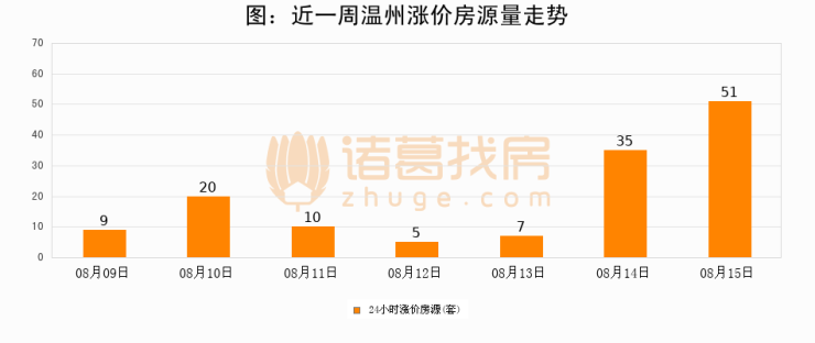 根据诸葛找房数据显示,温州24小时涨价房源量为51套,较08月14日增加16套,环比上涨45.7%。与此同时,涨价房源占比小幅扩大,业主信心有所提升。