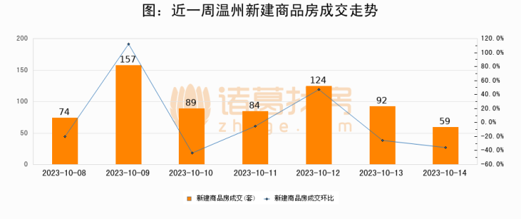 根据温州市住房和城乡建设局数据显示,2023年10月14日温州新建商品房成交59套,较昨日减少33套,环比下降35.9%