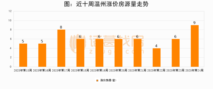 从调价房源来看,第24周温州涨价房源9套,较上周上涨50%。与此同时,24周涨价房源占比提升19.78个百分点,业主信心持续恢复。