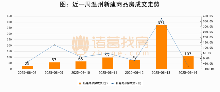 根据温州市住房和城乡建设局数据显示,2025年06月14日温州新建商品房成交107套,较昨日减少264套,环比下降71.2%