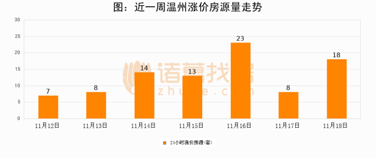 根据诸葛找房数据显示,温州24小时涨价房源量为18套,较11月17日增加10套,环比上涨125%。与此同时,涨价房源占比小幅扩大,业主信心有所提升。