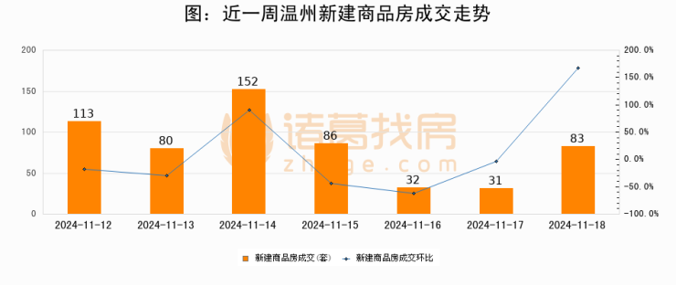 根据温州市住房和城乡建设局数据显示,2024年11月18日温州新建商品房成交83套,较昨日增加52套,环比上涨167.7%
