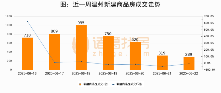 根据温州市住房和城乡建设局数据显示,2025年06月22日温州新建商品房成交289套,较昨日减少30套,环比下降9.4%