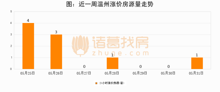 根据诸葛找房数据显示,温州24小时涨价房源量为1套,较05月30日增加1套,环比上涨0%。与此同时,涨价房源占比小幅扩大,业主信心有所提升。