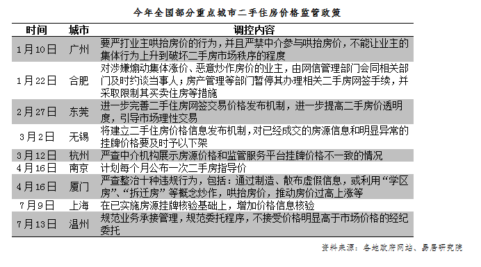 据易居研究院不完全统计,全国至少有9个城市对二手住房价格进行了重点规范和管控,涉及严打业主哄抬房价的行为、建立二手住房价格信息发布机制、增加价格信息核验等。