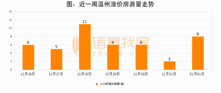 根据诸葛找房数据显示,温州24小时涨价房源量为8套,较12月31日增加6套,环比上涨300%。与此同时,涨价房源占比小幅扩大,业主信心有所提升。