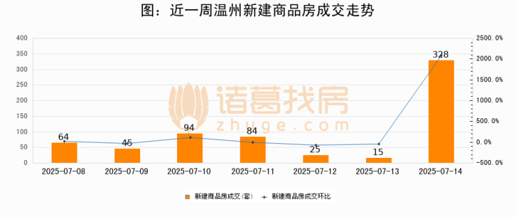 根据温州市住房和城乡建设局数据显示,2025年07月14日温州新建商品房成交328套,较昨日增加313套,环比上涨2086.7%