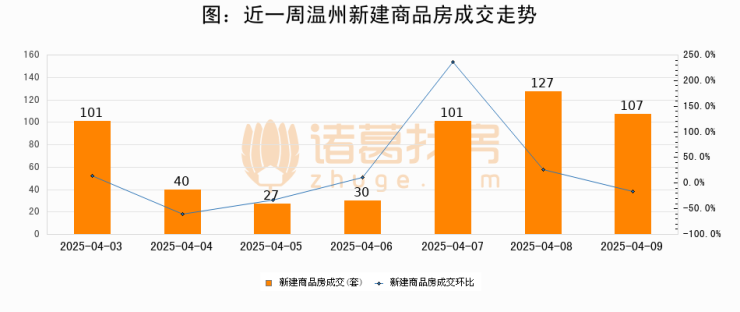 根据温州市住房和城乡建设局数据显示,2025年04月09日温州新建商品房成交107套,较昨日减少20套,环比下降15.8%