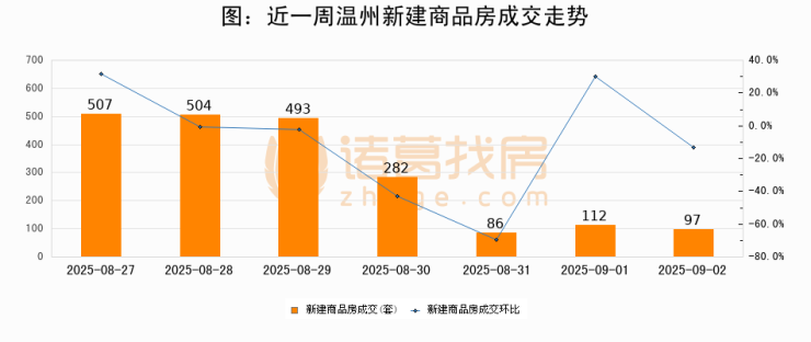 根据温州市住房和城乡建设局数据显示,2025年09月02日温州新建商品房成交97套,较昨日减少15套,环比下降13.4%