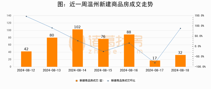 根据温州市住房和城乡建设局数据显示,2024年08月18日温州新建商品房成交32套,较昨日增加15套,环比上涨88.2%