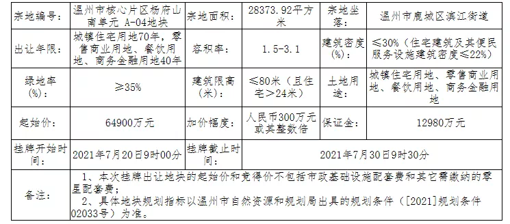 该地块位于温州市鹿城区滨江街道,实行“限房价、限溢价、竞地价、竞配建”的出让方式,地块的起拍价为64900万元,起始楼面价约为7378 元/㎡,设上限价格为84100万元(折合楼面价约为9561元/㎡),达到上限价格后竞报政策性住房面积,竞报保障性住房面积,较高竞报面积为87500平方米,预计出让时间为2021年7月30日9时30分。