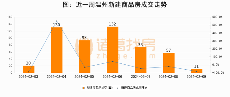 根据温州市住房和城乡建设局数据显示,2024年02月09日温州新建商品房成交11套,较昨日减少46套,环比下降80.7%