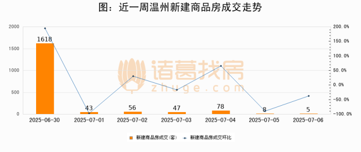根据温州市住房和城乡建设局数据显示,2025年07月06日温州新建商品房成交5套,较昨日减少3套,环比下降37.5%
