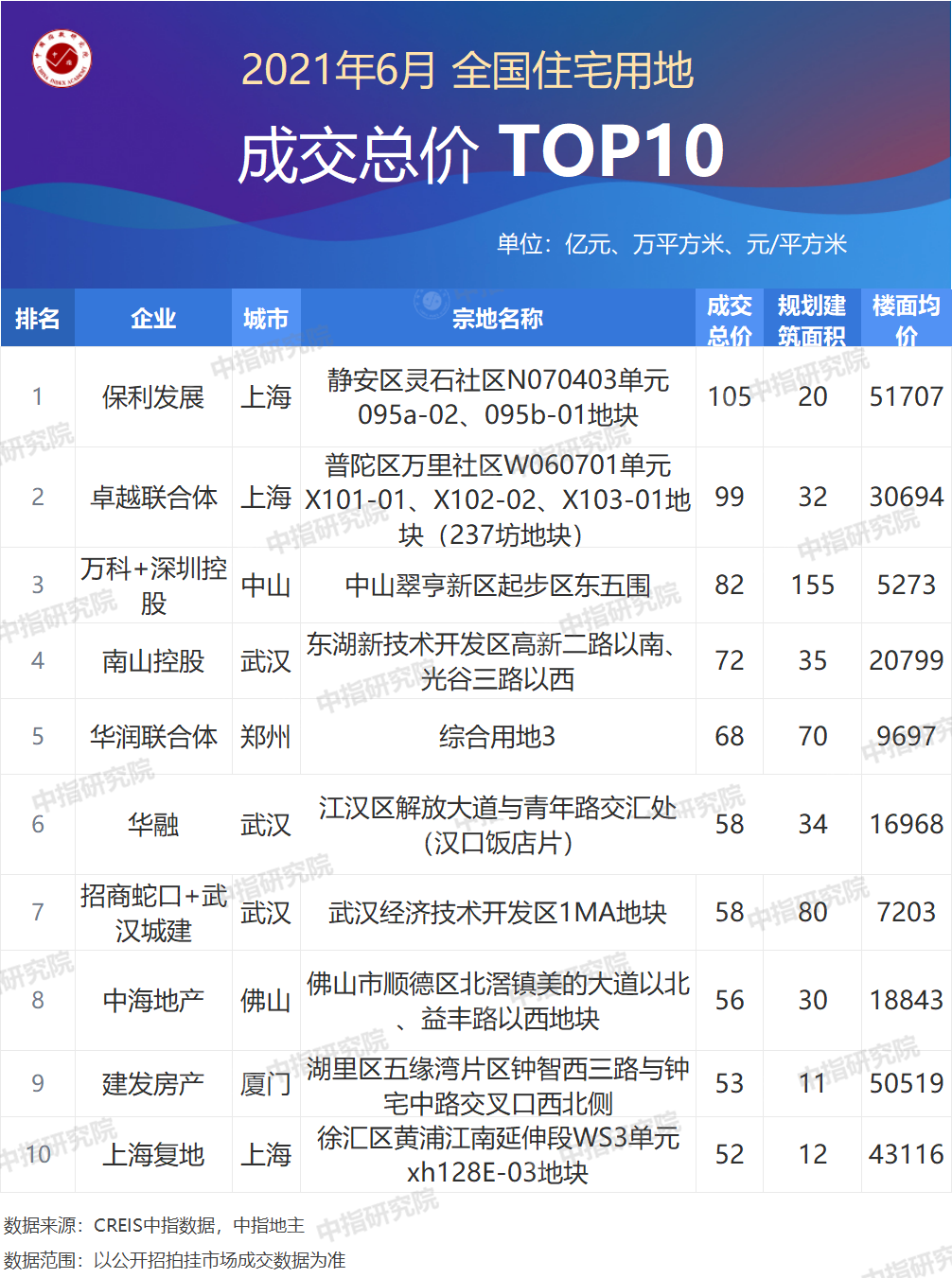从全国住宅用地成交总价TOP10来看,6月入榜地块主要集中于上海、武汉和中山,成交金额门槛为52亿元。