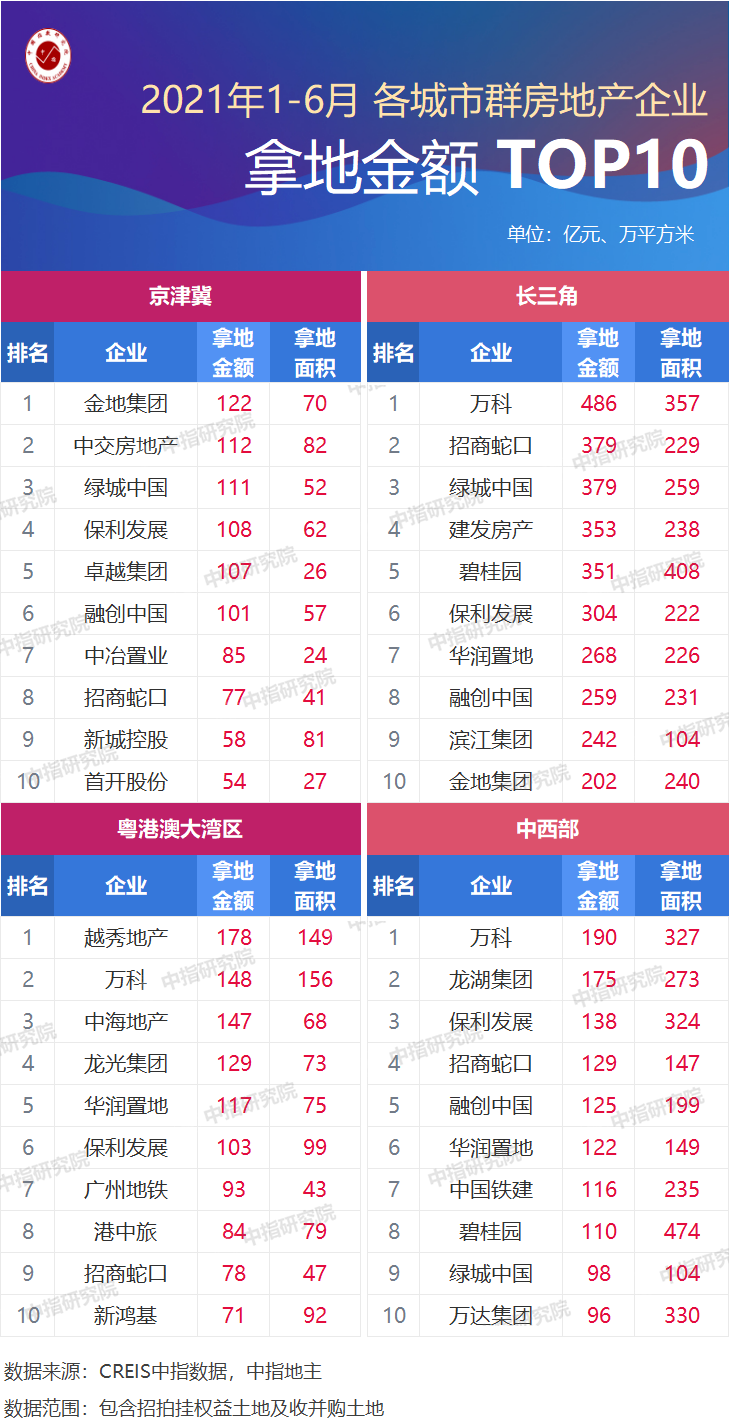 从各城市群拿地金额来看,长三角远高于其他城市群。上半年,长三角TOP10企业拿地金额3223亿元居四大城市群首位;中西部TOP10企业拿地金额1299亿元,位列第二;粤港澳大湾区TOP10企业拿地金额1148亿元,位列第三。拿地面积来看,中西部TOP10企业拿地面积以2562万平方米居四大城市群首位。