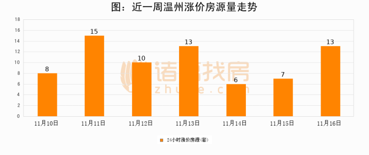 根据诸葛找房数据显示,温州24小时涨价房源量为13套,较11月15日增加6套,环比上涨85.7%。与此同时,涨价房源占比小幅扩大,业主信心有所提升。