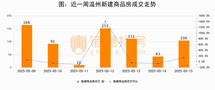 根据温州市住房和城乡建设局数据显示,2025年05月15日温州新建商品房成交104套,较昨日增加61套,环比上涨141.9%