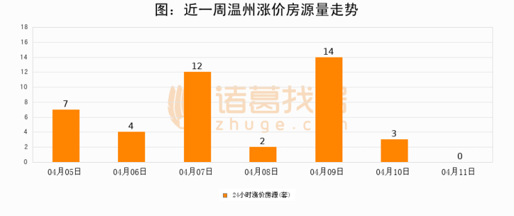 根据诸葛找房数据显示,温州24小时涨价房源量为0套,较04月10日减少3套,环比下降100%。与此同时,涨价房源占比小幅回落,对于购房者来说是一个入市窗口期,购房者可抓住时机入市。