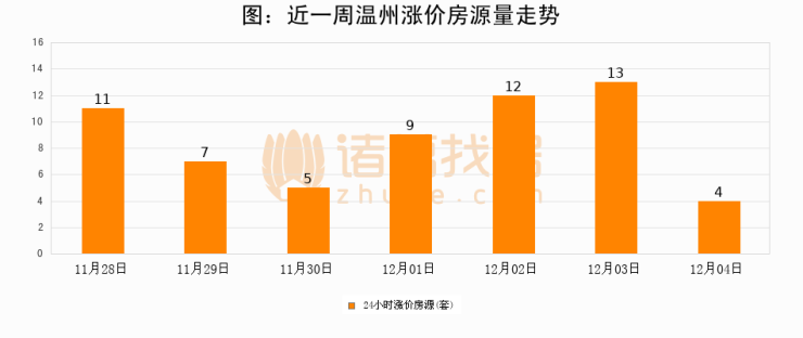 根据诸葛找房数据显示,温州24小时涨价房源量为4套,较12月03日减少9套,环比下降69.2%。与此同时,涨价房源占比小幅回落,对于购房者来说是一个入市窗口期,购房者可抓住时机入市。