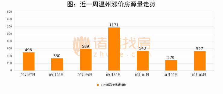 根据诸葛找房数据显示,温州24小时涨价房源量为527套,较10月02日增加248套,环比上涨88.9%。与此同时,涨价房源占比小幅扩大,业主信心有所提升。