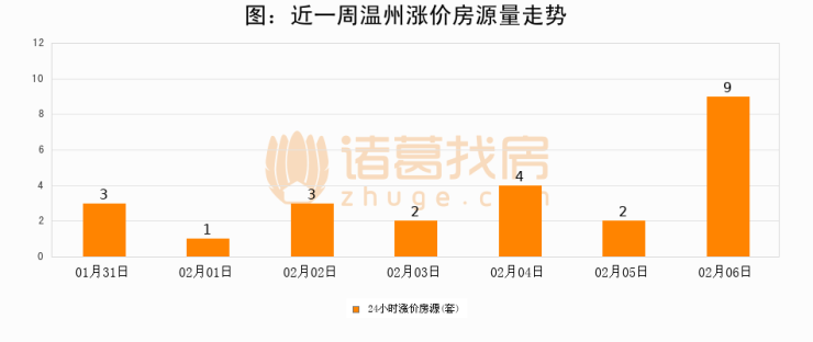 根据诸葛找房数据显示,温州24小时涨价房源量为9套,较02月05日增加7套,环比上涨350%。与此同时,涨价房源占比小幅扩大,业主信心有所提升。