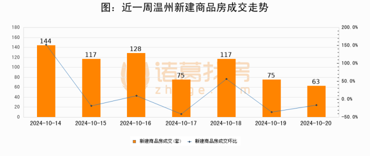 根据温州市住房和城乡建设局数据显示,2024年10月20日温州新建商品房成交63套,较昨日减少12套,环比下降16%
