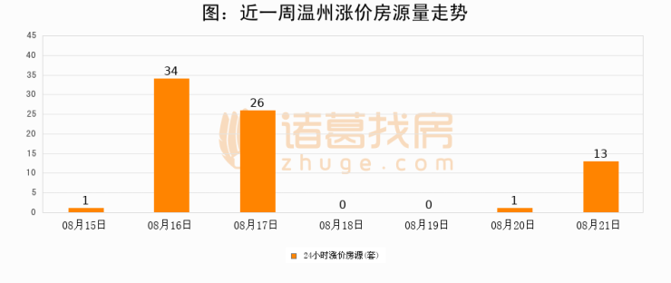 根据诸葛找房数据显示,温州24小时涨价房源量为13套,较08月20日增加12套,环比上涨1200%。与此同时,涨价房源占比小幅扩大,业主信心有所提升。