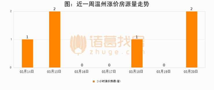 根据诸葛找房数据显示,温州24小时涨价房源量为2套,较03月19日增加2套,环比上涨0%。与此同时,涨价房源占比小幅扩大,业主信心有所提升。