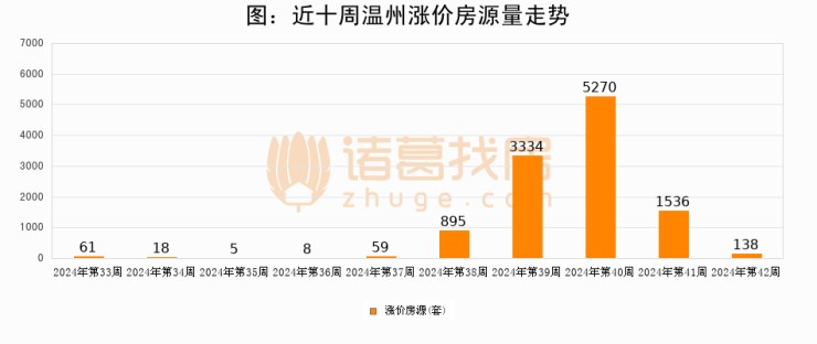 从调价房源来看,第42周温州涨价房源138套,较上周下降91%。与此同时,42周涨价房源占比回落0.29个百分点,业主信心小幅波动,购房者可则需入市。