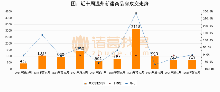 进入2024年第42周(10月14日-10月20日),温州新建商品房成交719套,较上周减少9套,环比下降1.2%