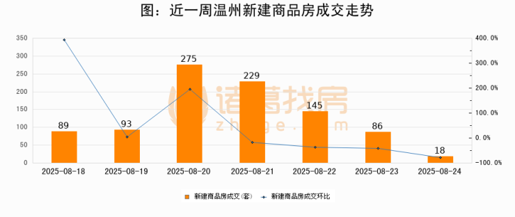 根据温州市住房和城乡建设局数据显示,2025年08月24日温州新建商品房成交18套,较昨日减少68套,环比下降79.1%