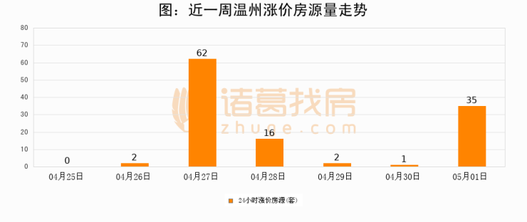 根据诸葛找房数据显示,温州24小时涨价房源量为35套,较04月30日增加34套,环比上涨3400%。与此同时,涨价房源占比小幅扩大,业主信心有所提升。