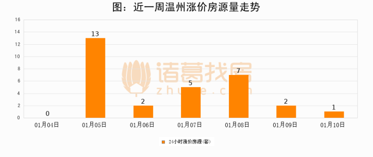 根据诸葛找房数据显示,温州24小时涨价房源量为1套,较01月09日减少1套,环比下降50%。与此同时,涨价房源占比小幅回落,对于购房者来说是一个入市窗口期,购房者可抓住时机入市。