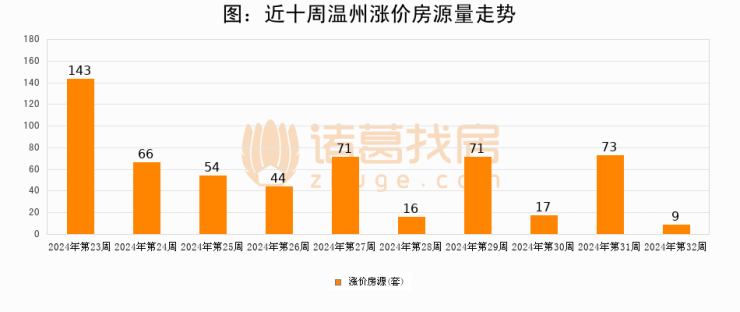 从调价房源来看,第32周温州涨价房源9套,较上周下降87.7%。与此同时,32周涨价房源占比提升5.51个百分点,业主信心持续恢复。