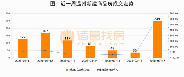 根据温州市住房和城乡建设局数据显示,2025年03月17日温州新建商品房成交249套,较昨日增加214套,环比上涨611.4%。近一周温州新建商品房日均成交118套。03月17日单日成交249套,高于近一周平均水平111%。