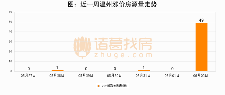 根据诸葛找房数据显示,温州24小时涨价房源量为49套,较06月01日增加49套,环比上涨0%。与此同时,涨价房源占比小幅扩大,业主信心有所提升。