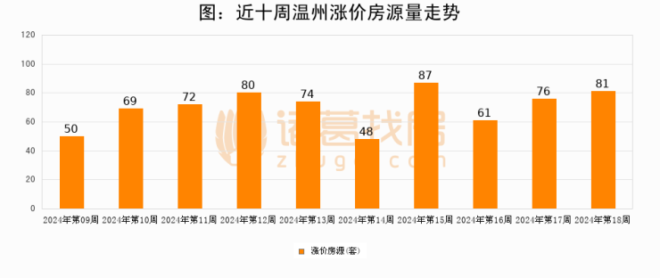 从调价房源来看,第17周温州涨价房源81套,较上周上涨6.6%。与此同时,17周涨价房源占比回落0.75个百分点,业主信心小幅波动,购房者可则需入市。