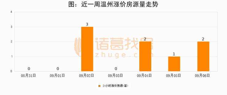根据诸葛找房数据显示,温州24小时涨价房源量为2套,较09月05日增加1套,环比上涨100%。与此同时,涨价房源占比小幅扩大,业主信心有所提升。