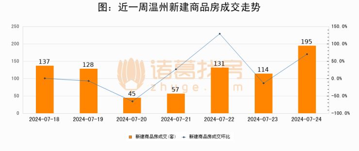 根据温州市住房和城乡建设局数据显示,2024年07月24日温州新建商品房成交195套,较昨日增加81套,环比上涨71%