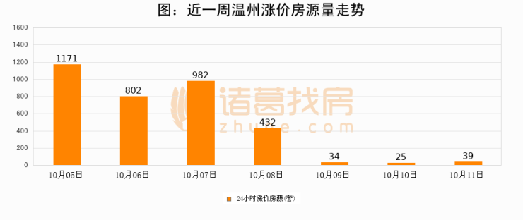 根据诸葛找房数据显示,温州24小时涨价房源量为39套,较10月10日增加14套,环比上涨56%。与此同时,涨价房源占比小幅扩大,业主信心有所提升。