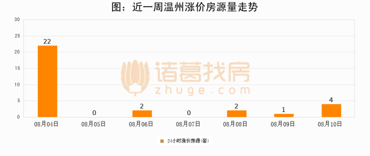 根据诸葛找房数据显示,温州24小时涨价房源量为4套,较08月09日增加3套,环比上涨300%。与此同时,涨价房源占比小幅扩大,业主信心有所提升。