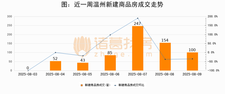 根据温州市住房和城乡建设局数据显示,2025年08月09日温州新建商品房成交100套,较昨日减少54套,环比下降35.1%。近一周温州新建商品房日均成交98套。08月09日单日成交100套,高于近一周平均水平2%。