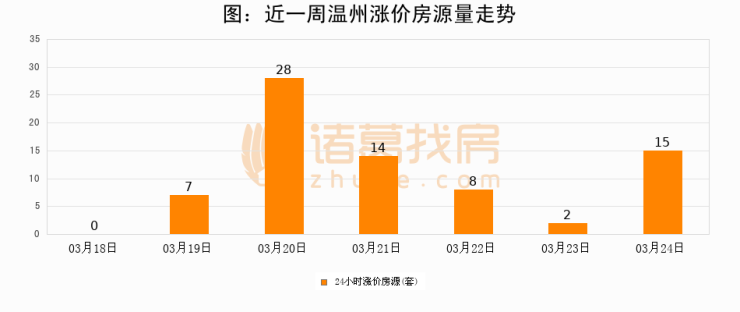 根据诸葛找房数据显示,温州24小时涨价房源量为15套,较03月23日增加13套,环比上涨650%。与此同时,涨价房源占比小幅扩大,业主信心有所提升。