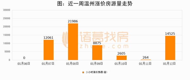 根据诸葛找房数据显示,温州24小时涨价房源量为14525套,较05月11日增加14261套,环比上涨5401.9%。与此同时,涨价房源占比小幅扩大,业主信心有所提升。