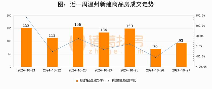 根据温州市住房和城乡建设局数据显示,2024年10月27日温州新建商品房成交93套,较昨日增加23套,环比上涨32.9%