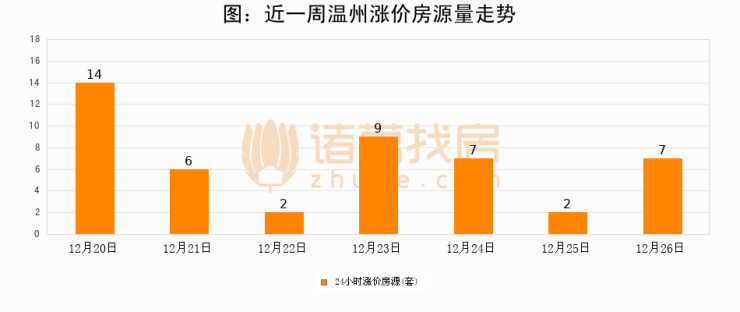 根据诸葛找房数据显示,温州24小时涨价房源量为7套,较12月25日增加5套,环比上涨250%。与此同时,涨价房源占比小幅扩大,业主信心有所提升。
