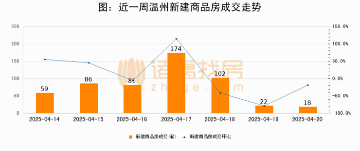 根据温州市住房和城乡建设局数据显示,2025年04月20日温州新建商品房成交18套,较昨日减少4套,环比下降18.2%