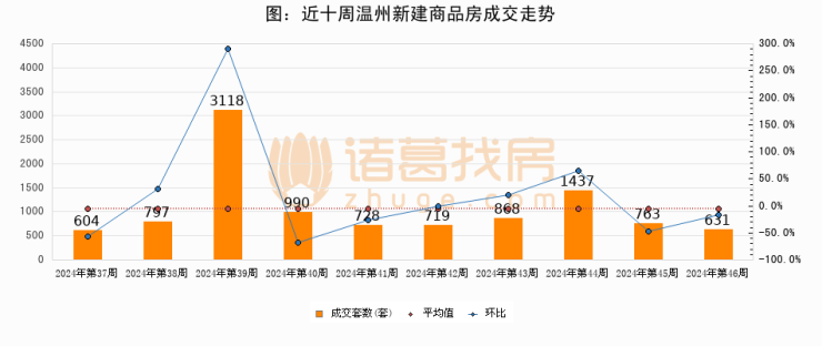 进入2024年第46周(11月11日-11月17日),温州新建商品房成交631套,较上周减少132套,环比下降17.3%