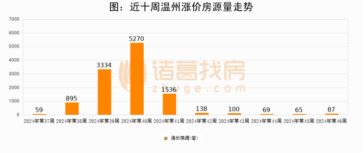 从调价房源来看,第46周温州涨价房源87套,较上周上涨33.8%。与此同时,46周涨价房源占比提升2.38个百分点,业主信心持续恢复。