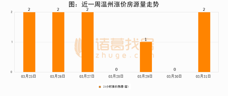 根据诸葛找房数据显示,温州24小时涨价房源量为2套,较03月30日增加2套,环比上涨0%。与此同时,涨价房源占比小幅扩大,业主信心有所提升。